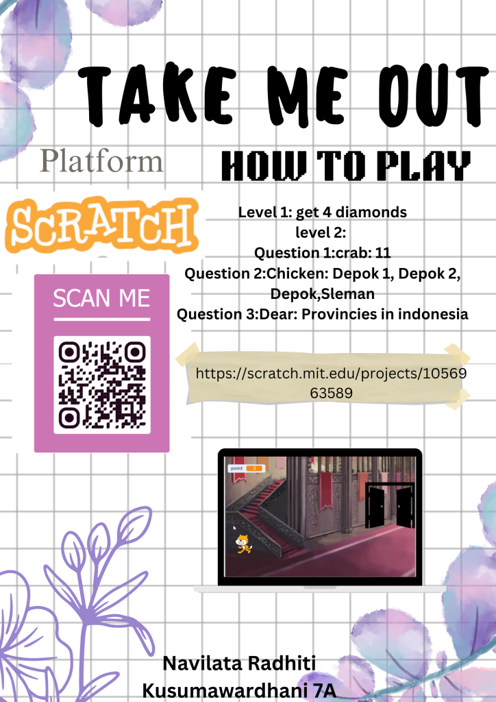 Game Take Me Out Level 1: get 4 diamondslevel 2: Question 1:crab: 11Question 2:Chicken: Depok 1, Depok 2, Depok,SlemanQuestion 3:Dear:
